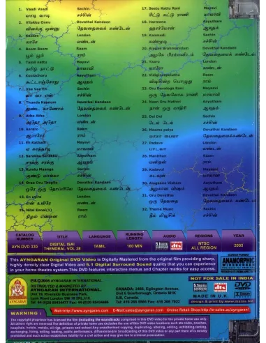 Description: Collection of 32 songs. Codage: Multi-zones Langue: Tamoule Audio: Dolby Digital 5.1 / DTS 5.1 Sous-titre: Anglais Durée: (environ) 160 minutes Bonus: Menus Interactive, Sélection des clips, Sous-titres...